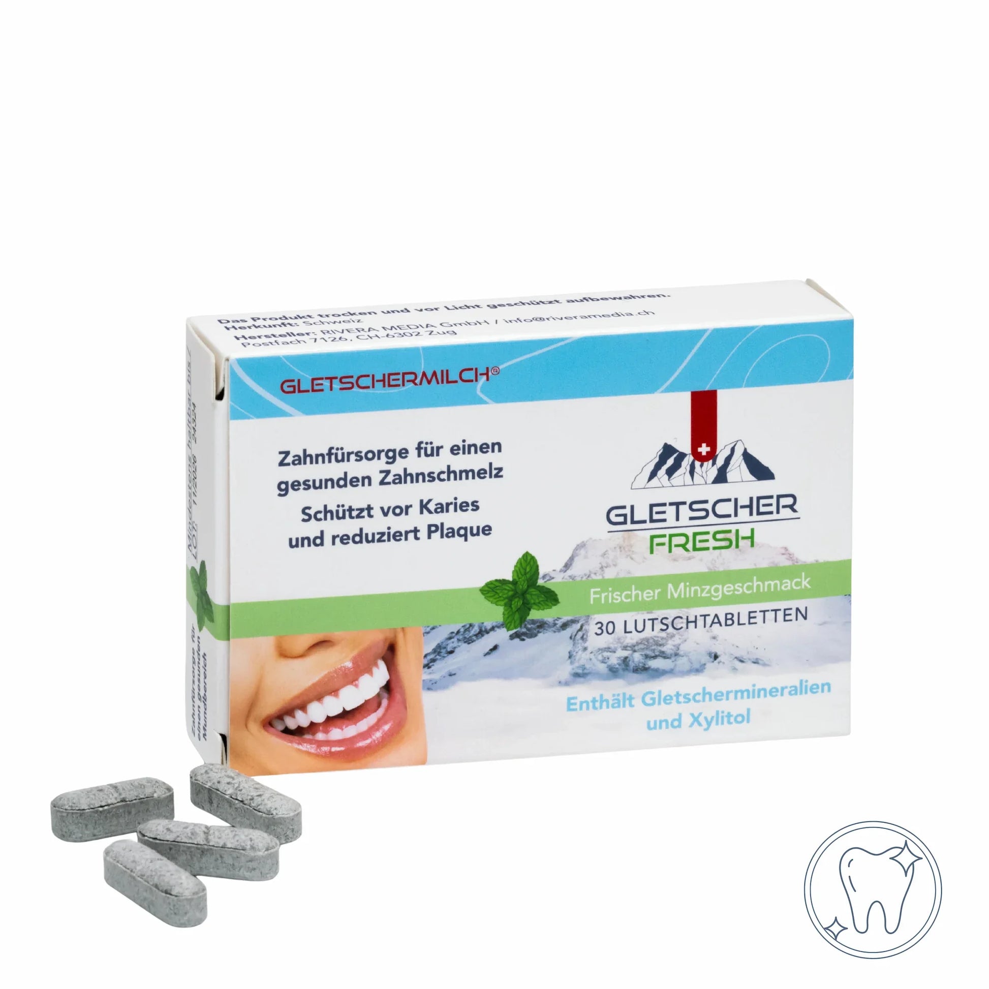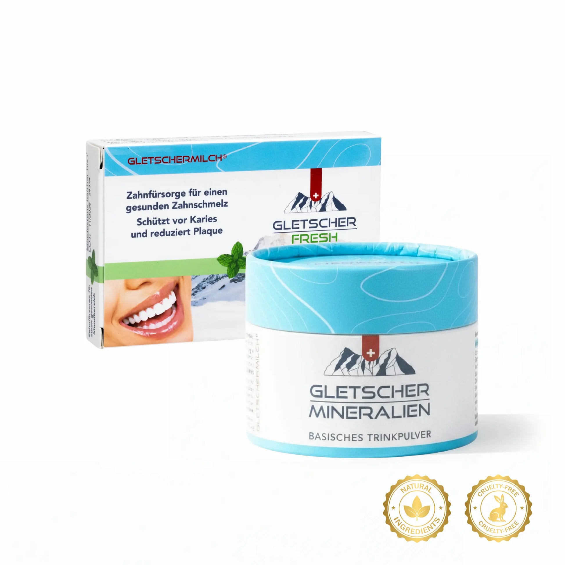 Diese Kombination umfasst jeweils einen Monat Gletschermineralien und Gletscher-Fresh – ideal, um deinen natürlichen Basenhaushalt zu unterstützen und dir täglich ein frisches Lächeln zu schenken.